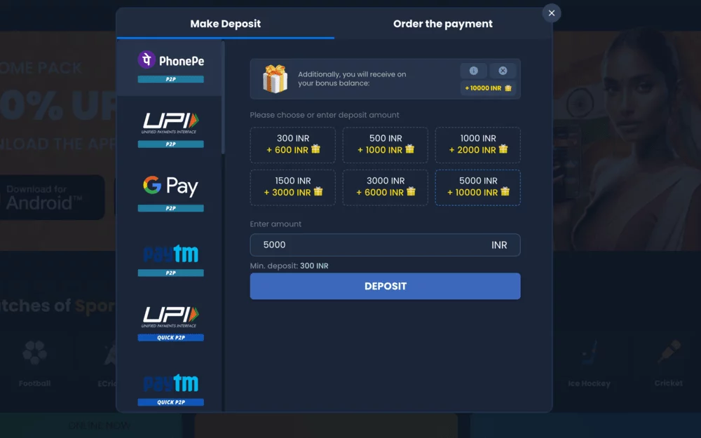 Welcome bonus up to 20,000 INR. New users get bonus funds on their first deposit for sports or casino.