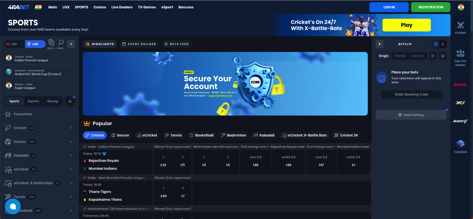 Indian users heavily use live betting for IPL and international cricket matches, following the action ball by ball. The live section also covers football, basketball, tennis, and other sports depending on the daily schedule.